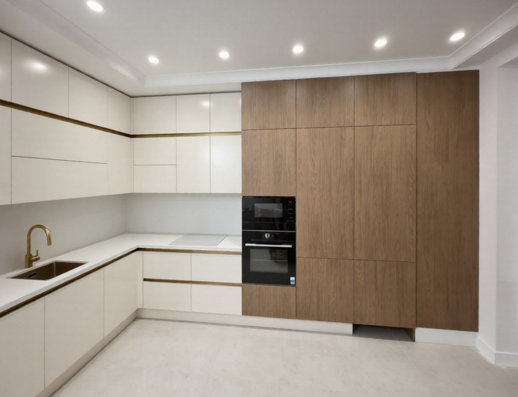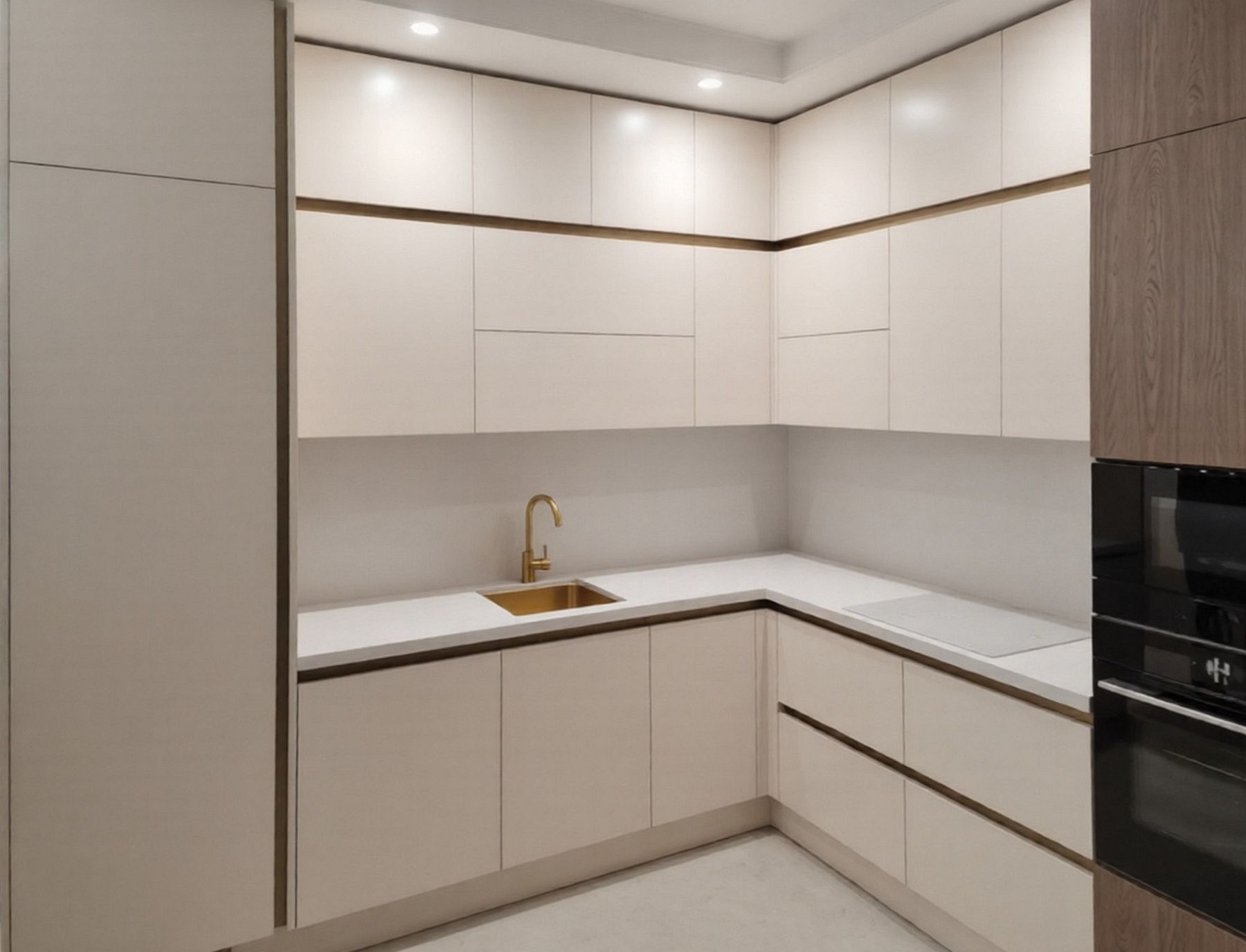 Угловая кухня с золотым профилем и скрытыми местами для хранения